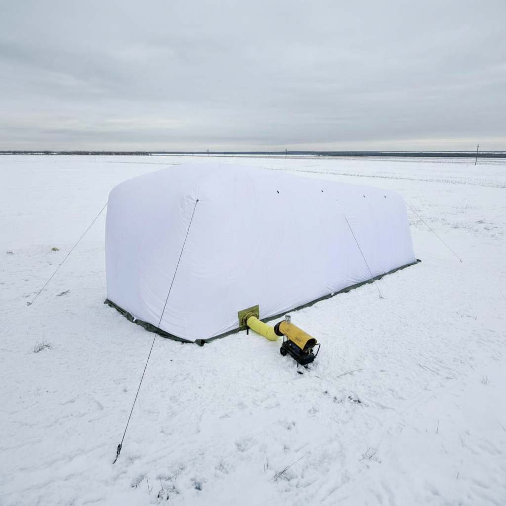 Бескаркасная палатка — это мобильный тёплый ангар, обеспечивающий комфортную работу с техникой даже при экстремально низких температурах.