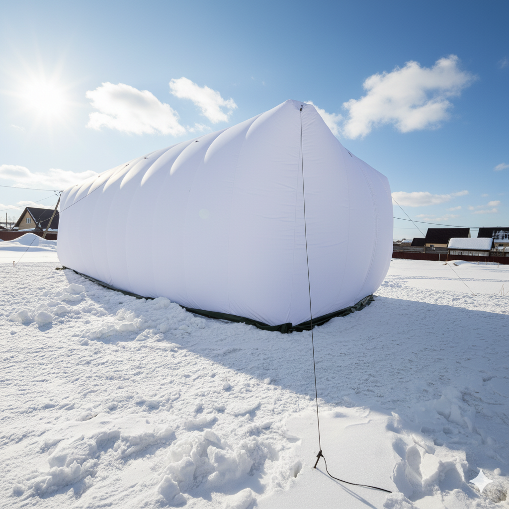 Бескаркасная палатка — это мобильный тёплый ангар, обеспечивающий комфортную работу с техникой даже при экстремально низких температурах.